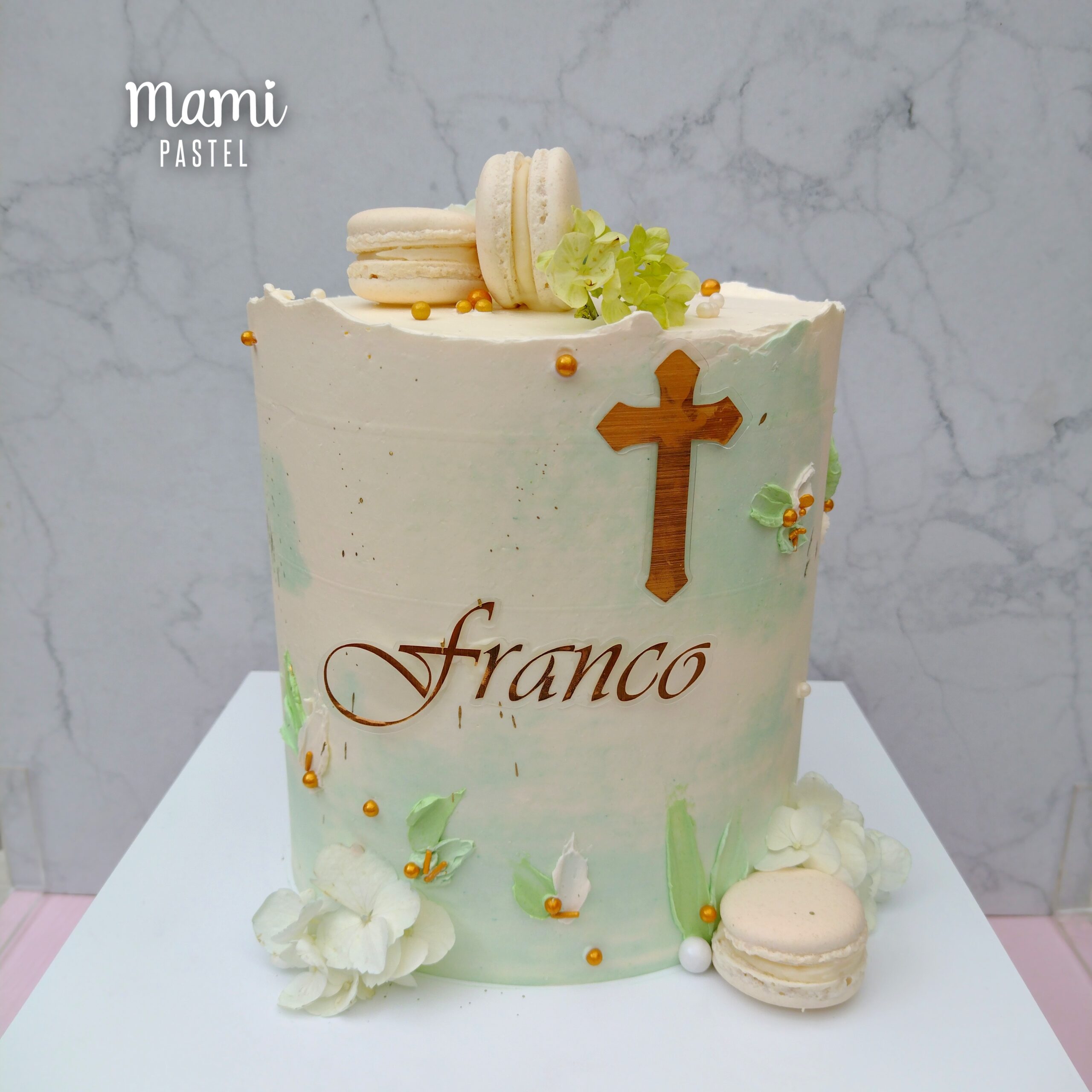 Pastel 25 porciones cubierta en crema de chocolate y decorado con macarons.